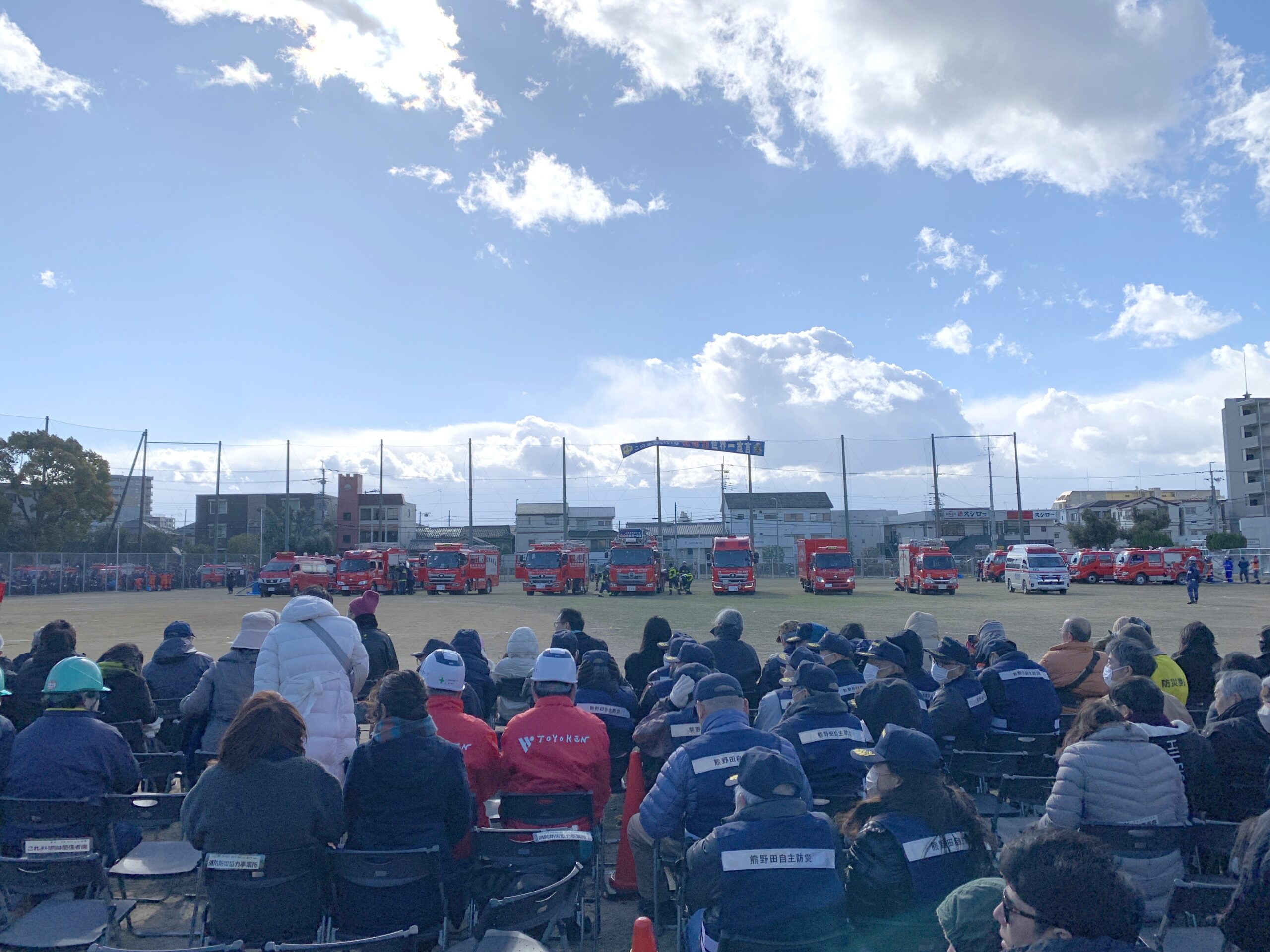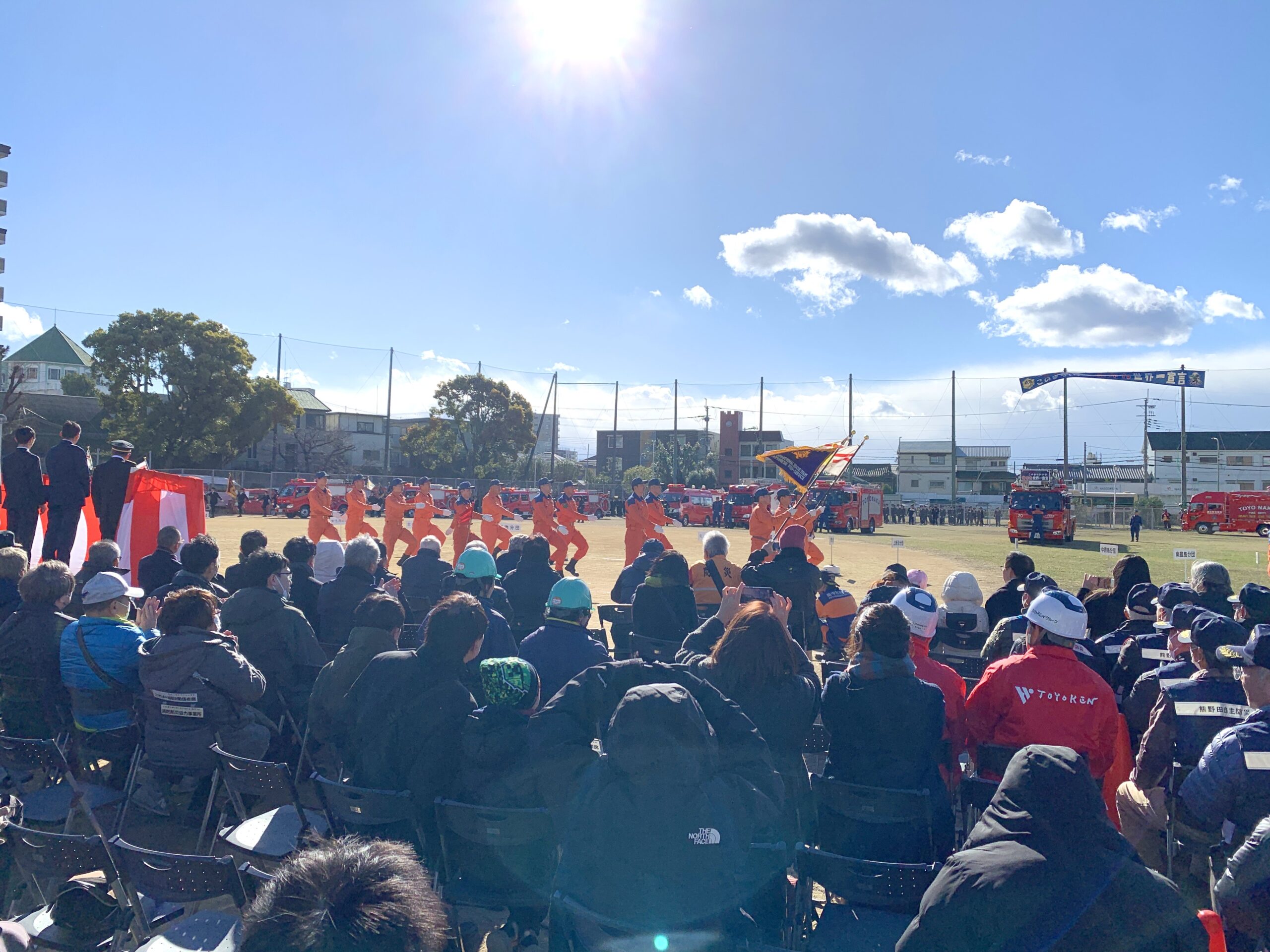 強風の中、大門公園で開催された令和8年 豊中市消防出初式に参加しました。